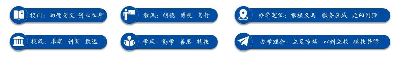 办学以来,学校坚持深化“义乌发展经验”,秉承“尚德崇文 创业立身”的校训精神,坚持“根植义乌、服务区域、走向国际”的办学定位,走出一条以“创”立校的特色办学之路。学校是浙江省高职高水平学校、浙江省优质高职院校、首批浙江省创业型大学建设试点院校,获评全国创新创业典型经验高校,连续两年上榜全国高职院校服务贡献典型学校60强榜单、全国高职院校教师发展指数100所优秀院校名单、全国高职院校学生发展指数100所优秀院校名单,荣登《2023中国职业教育质量年度报告》“人才培养卓越校”“服务贡献卓越校”“产教融合卓越校”全部榜单。学校连续两年位列全省综合考核高职高专院校第一等次,2024年度荣获全省综合考核先进单位。